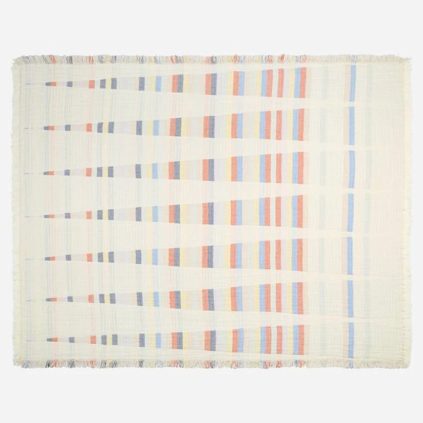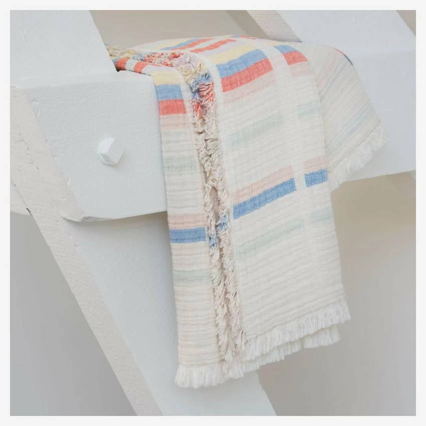 Le plaid Tabata en gaze de coton adopte un coloris beige ainsi qu’un motif multicolore aux lignes géométriques. Frangé sur les bords, il mesure 130 x 170 cm.