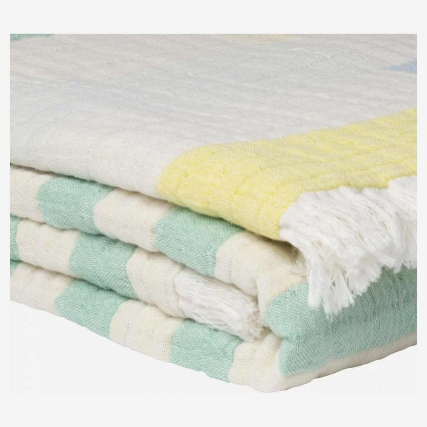 Fabriqué au Portugal, le plaid Agathe est en gaze de coton. Ce type de tissage confère à l’étoffe une extrême douceur ainsi qu’un aspect gaufré et vaporeux, très esthétique.