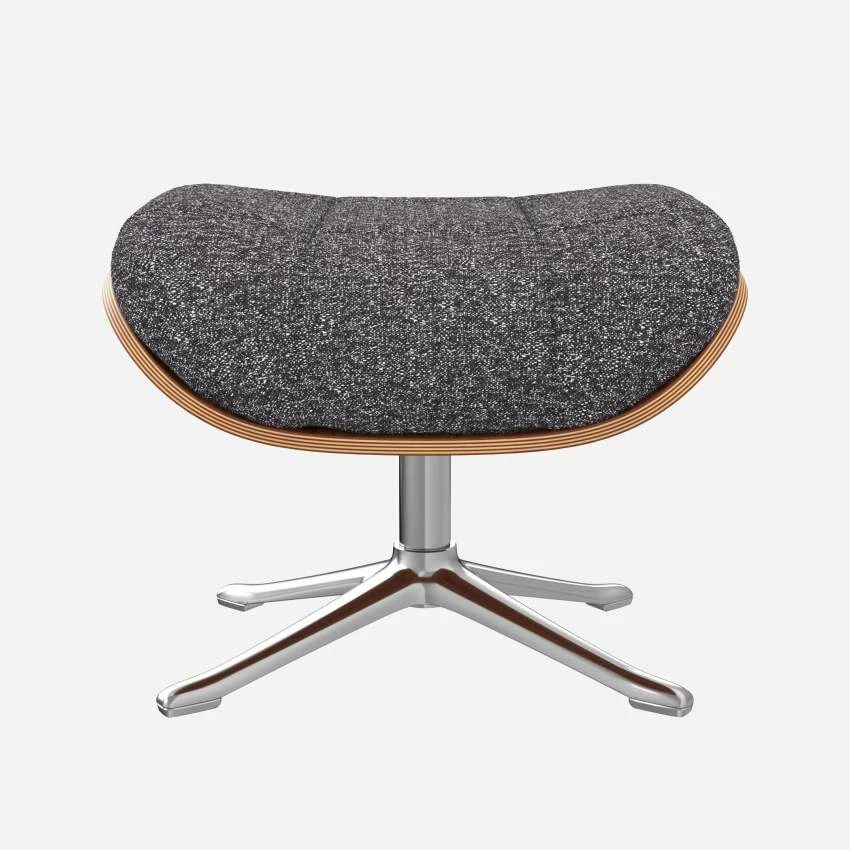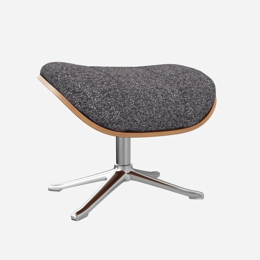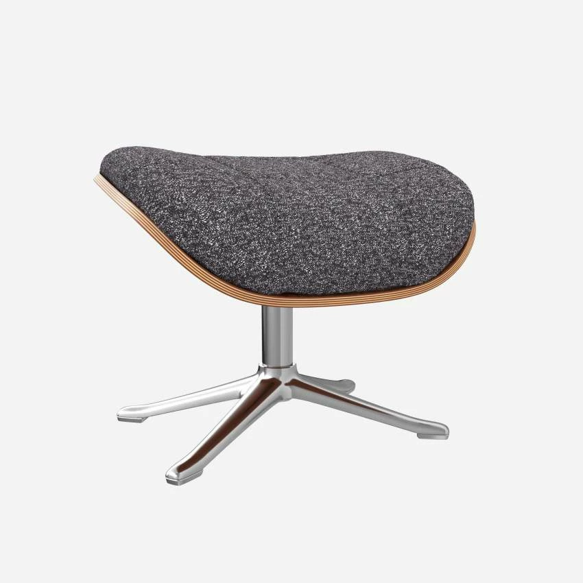 Le repose-pieds Marc en noyer et tissu Lucca bleu zingué avec pied aluminium offre un confort ultime.