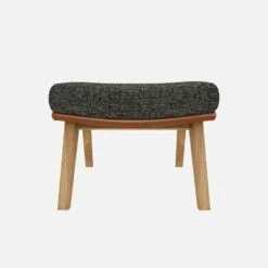 Le repose-pieds en tissu Alba gris nuage et cuir Vintage avec pieds chêne peut être associé avec le fauteuil de la même collection.