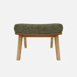 Le repose-pieds en tissu Alba vert orage et cuir Vintage avec pieds chêne peut être associé avec le fauteuil de la même collection.