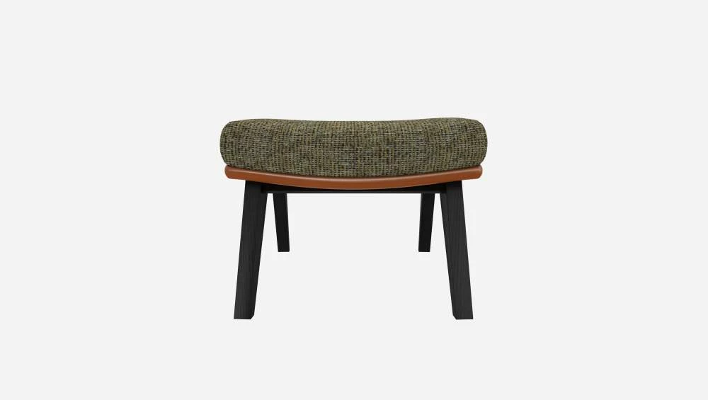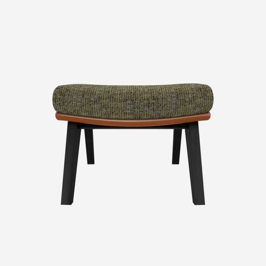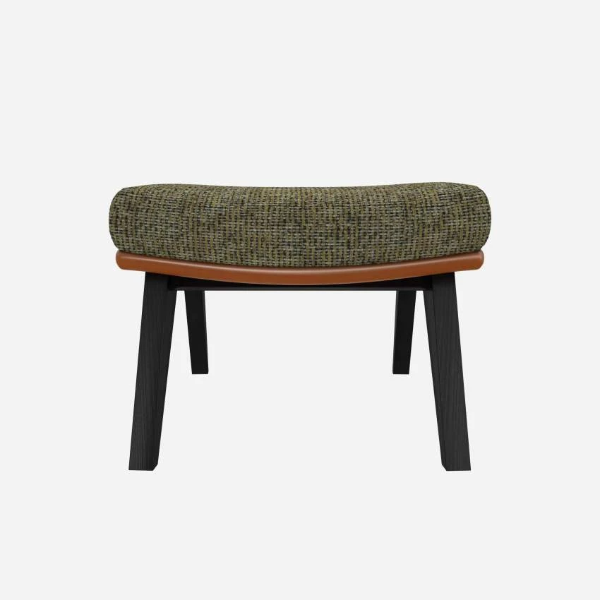 Le repose-pieds en tissu Alba vert orage et cuir Vintage avec pieds noirs peut être associé avec le fauteuil de la même collection.