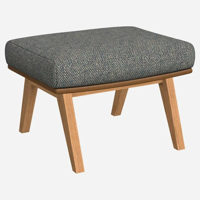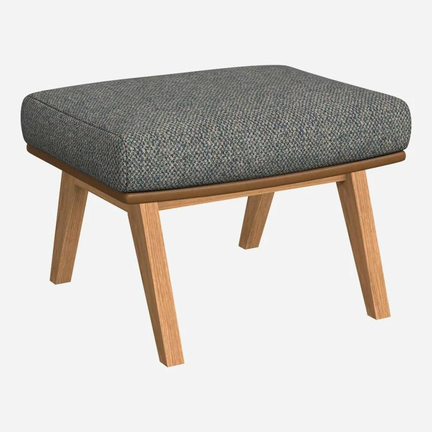 Le repose-pieds en tissu Bellagio bleu céleste et cuir Vintage avec pieds chêne peut être associé avec le fauteuil de la même collection.