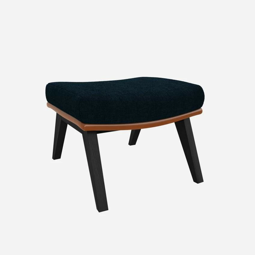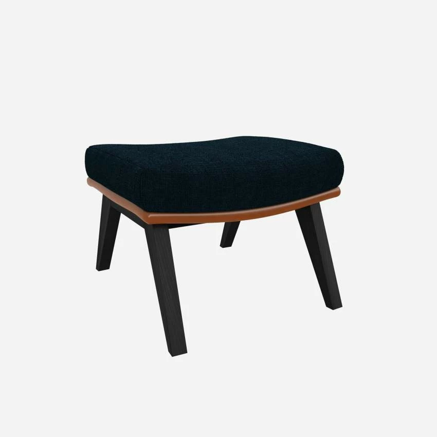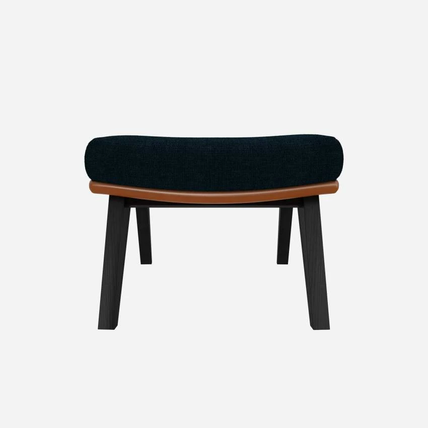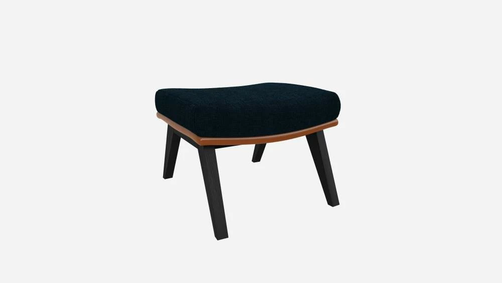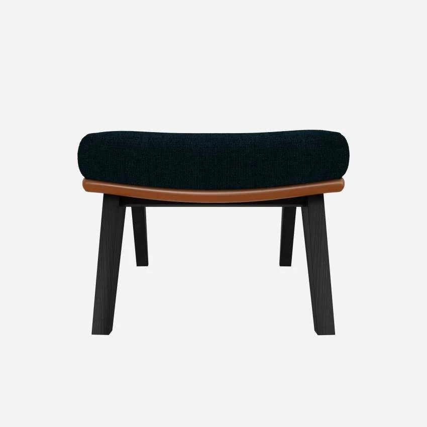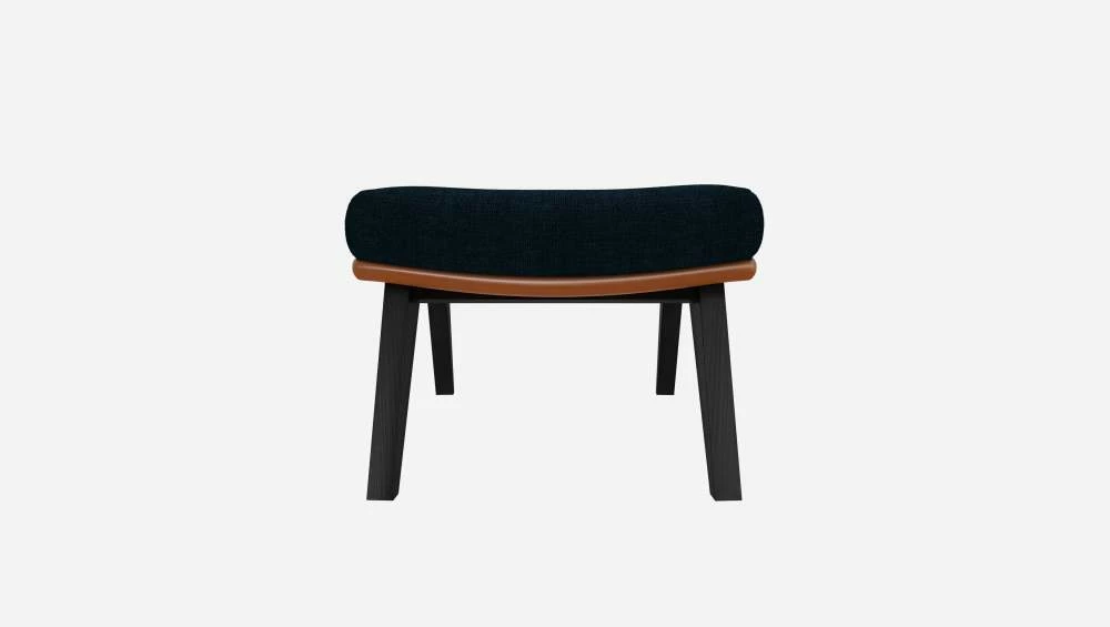Le repose-pieds en tissu Melina bleu encreet cuir Vintage avec pieds noirs peut être associé avec le fauteuil de la même collection.