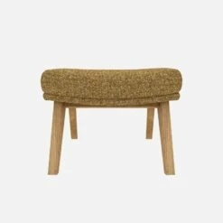 Le repose-pieds en tissu Venezia jaune épice avec pieds chêne peut être associé avec le fauteuil de la même collection.
