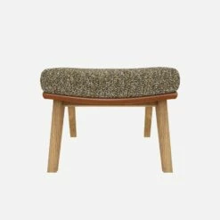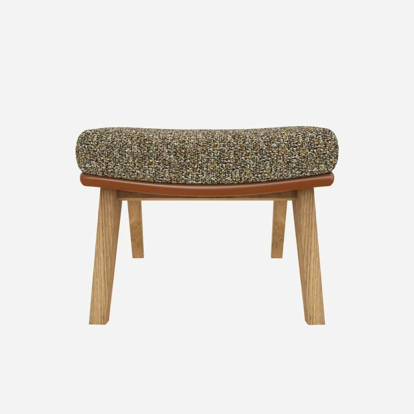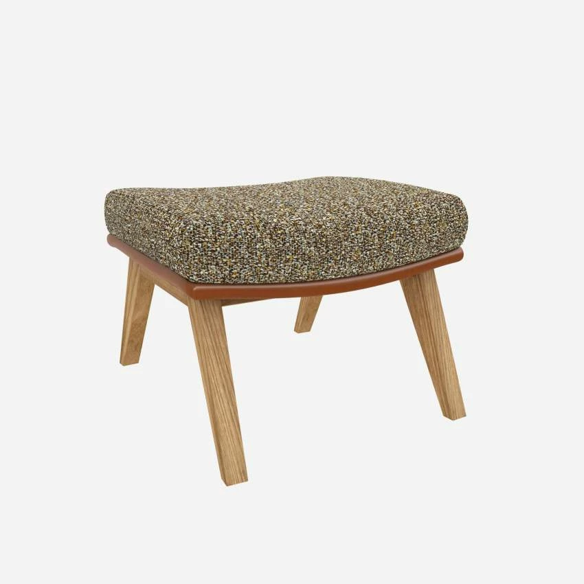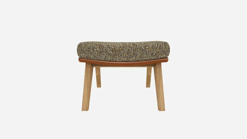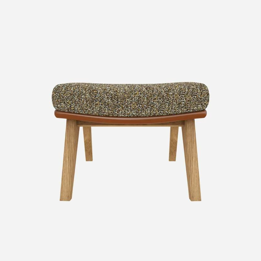 Le repose-pieds en tissu Venezia vert lichen et cuir Vintage avec pieds chêne peut être associé avec le fauteuil de la même collection.