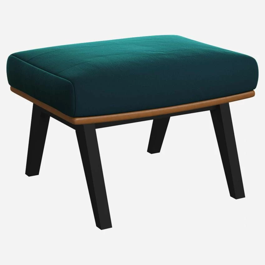 Le repose-pieds en en velours vert émeraude et cuir Vintage avec pieds noirs peut être associé avec le fauteuil de la même collection.