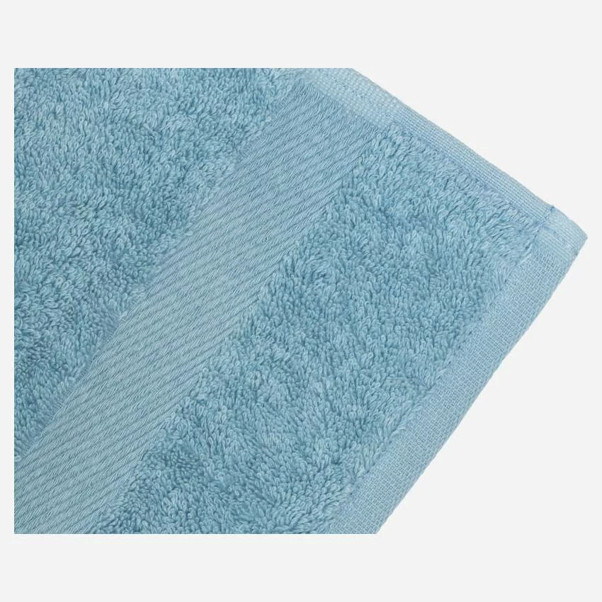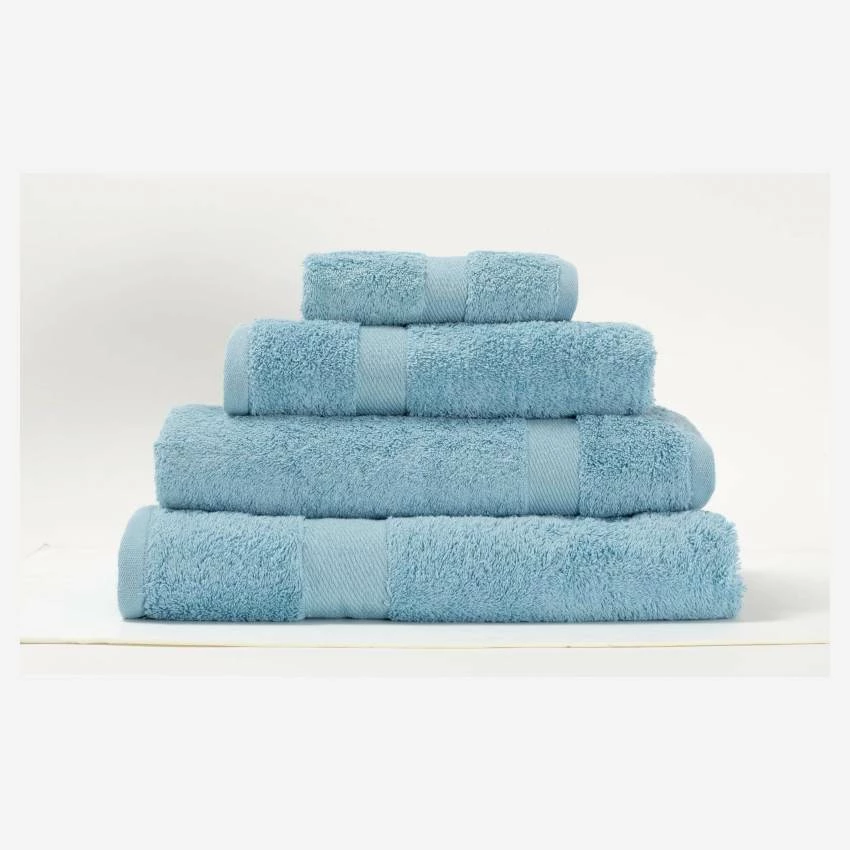 La serviette de bain Naxos existe en plusieurs coloris. Elle est proposée ici en bleu.