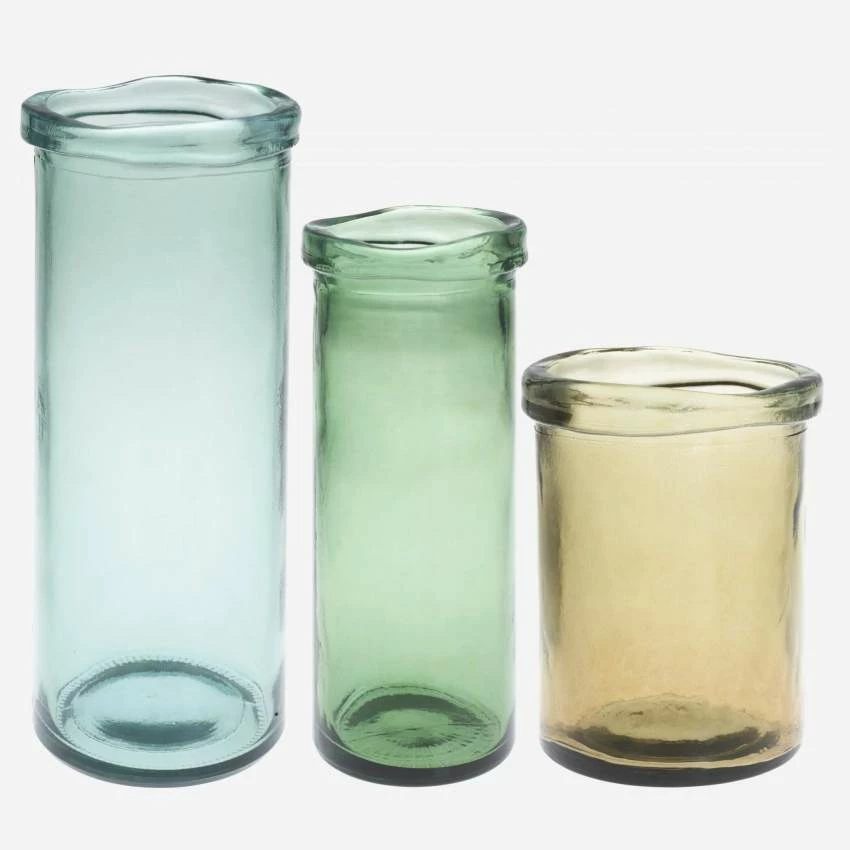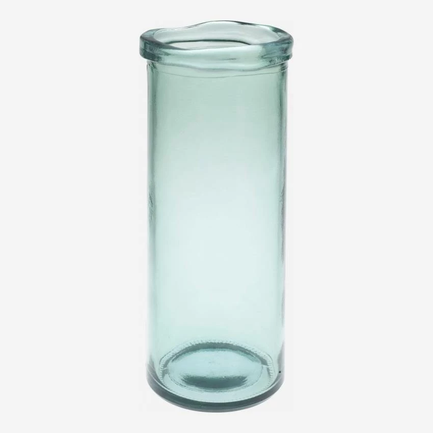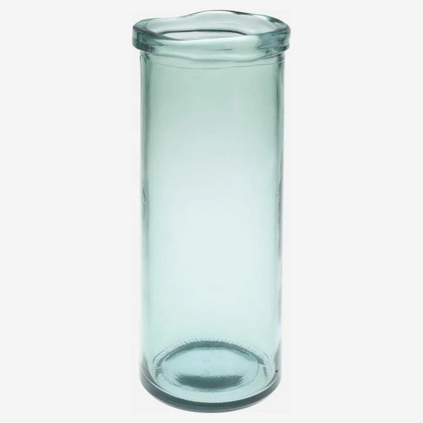 Le vase Pohème en verre recyclé de couleur verte mesure 36 cm de hauteur. De forme cylindrique, il possède une large ouverture pour laisser respirer vos bouquets et autres compositions florales.